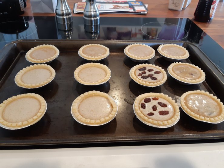 Now once you have all your ingredients mixed together in your bowl you will have to get the tarts ready. I put all of them onto a large baking sheet. Now your mixture is going to look a little grainy. What I mean by this is that it isn’t completely smooth and that’s ok. Your going to need to put your raisins into the cups if you would like to add them. If not you can simply skip that step and move on to filling the tarts. So when you pore it in make sure to be careful because it can go side ways in a bad way. I tried to just go slow but they fill up pretty frickin quickly. With the raisins you can either put them on the bottom or the top which ever one makes ya happy.