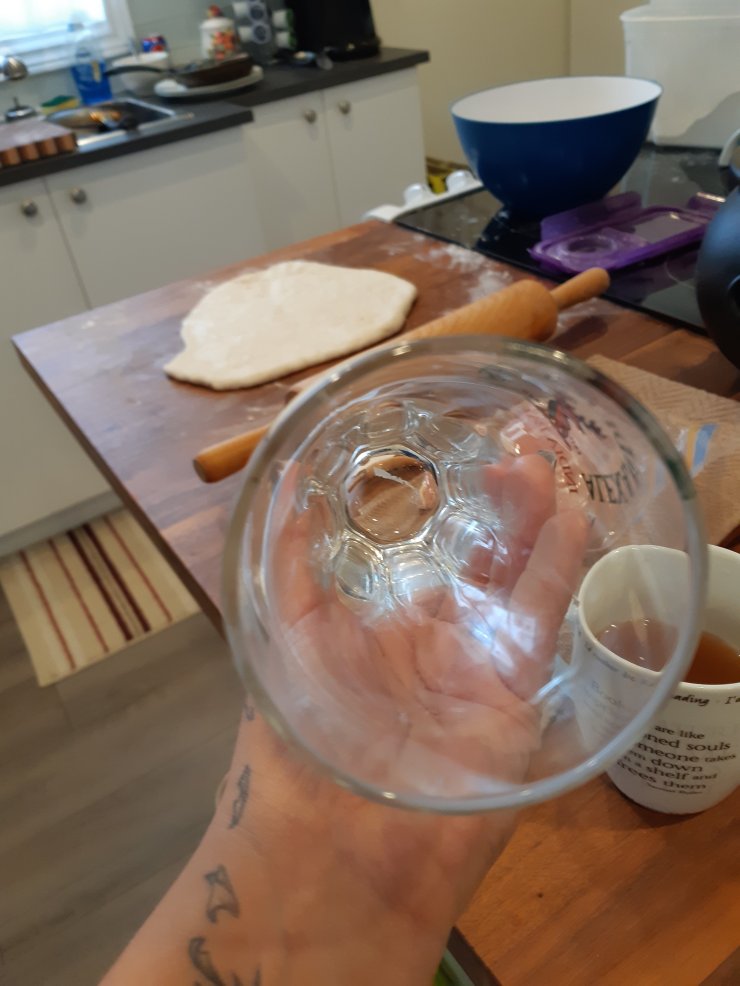 Once you have that all rolled out you can get a cookie cutter to cut out round biscuits. I was shocked to learn I didn’t have a round cookie cutter….weird. But all you need to do is get a glass and use the rim as the cutter. Now it’s hard to describe what the thickness should be so you will have to judge from the pictures as I did not feel motivated enough to get something to measure it with. I love you guys but not enough to measure biscuit thickness. (the recipe says 1/2 inch. so cu-toes to lenihan5 at all recipes for being super accurate)